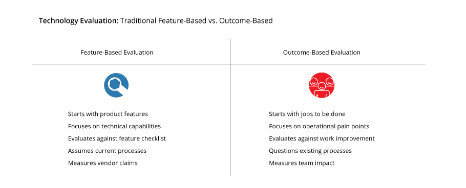 Rather than the traditional approach of making a laundry list of functions—and then evaluating each vendor or solution by how many checkmarks they get—outcome-based analysis focuses on what outcomes or changes to your current working conditions you want to bring about.
