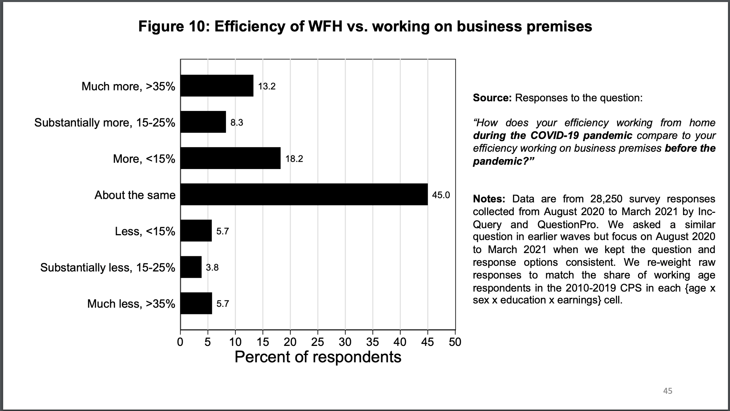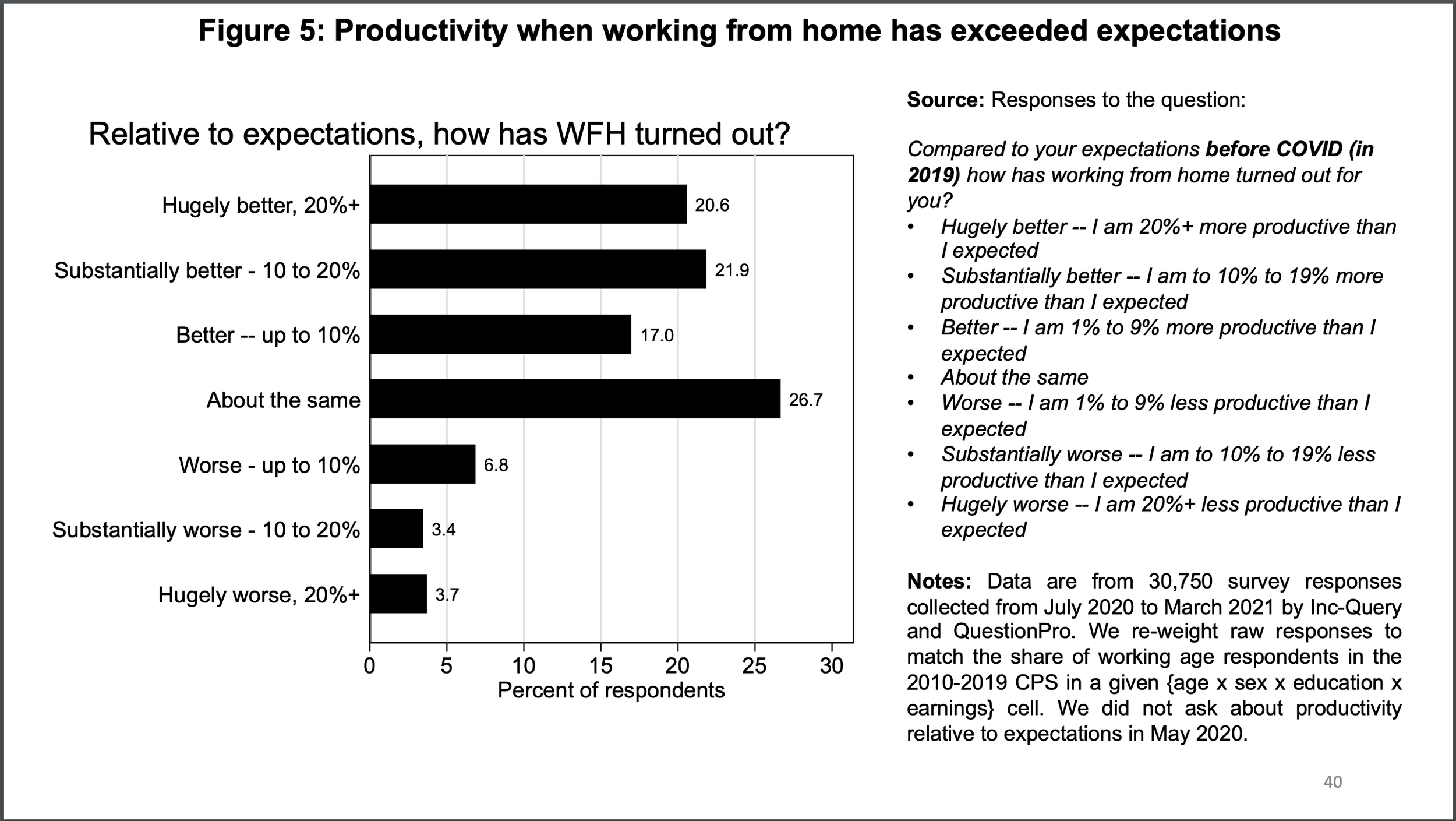 More recent work from Bloom et al. at Stanford, "Why Working From Home Will Stick", (April 2021) estimates that higher rates of ongoing WFH will boost overall productivity by 4.6% even after post-pandemic levels of WFM have decreased.
