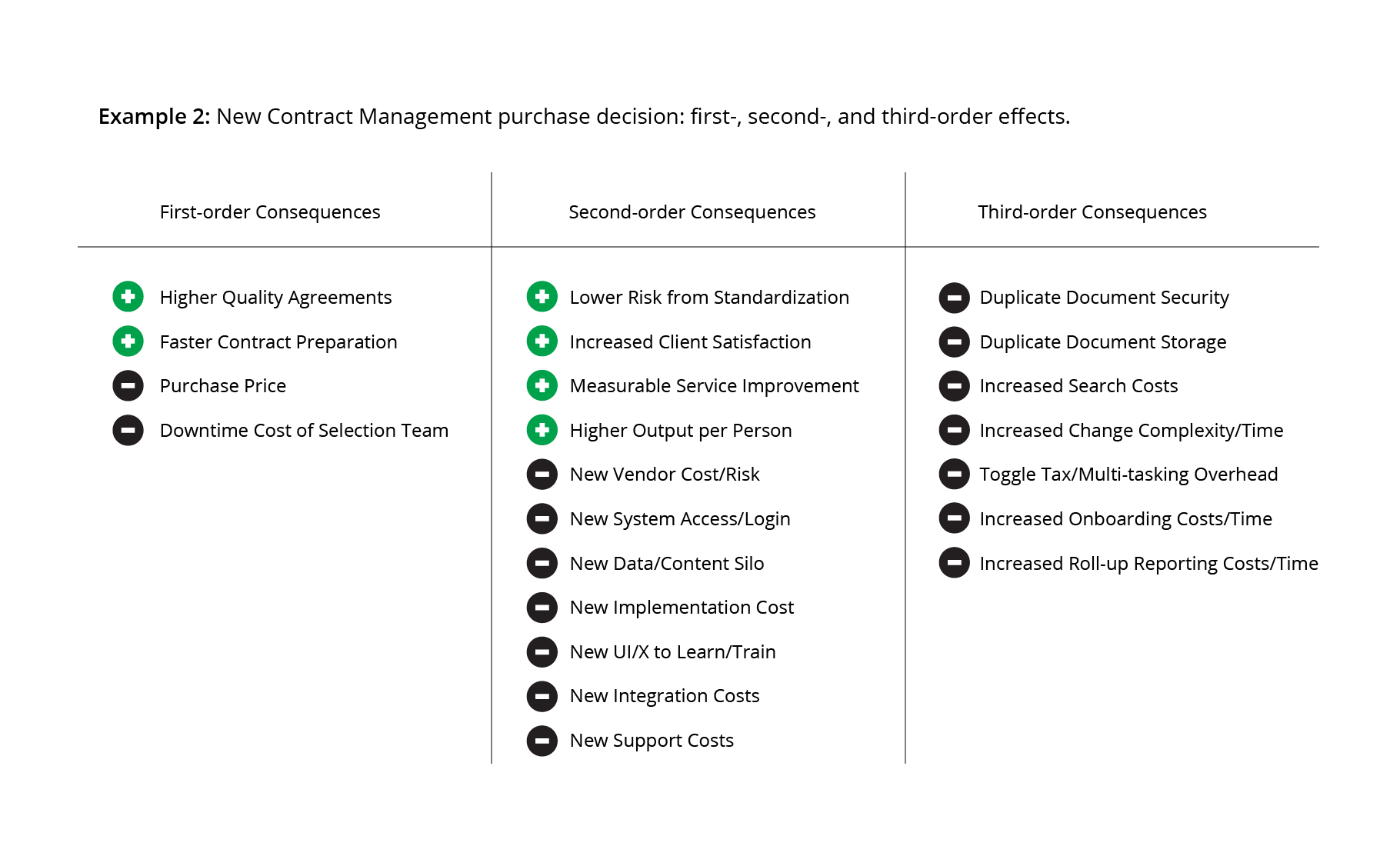 Now, let's get to the "stack" part of the analysis. For each solution you are considering purchasing and implementing as part of your LegalTech Stack, you should also be analysing the second- and subsequent order effects.