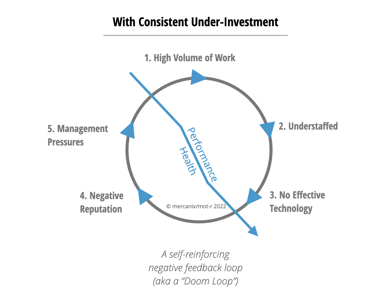 The first thing you should know is it’s not your fault. You are caught in a classic doom loop; a self-reinforcing negative feedback loop that continues to drive-down performance and drive-up your working hours because of systemic under-investment.