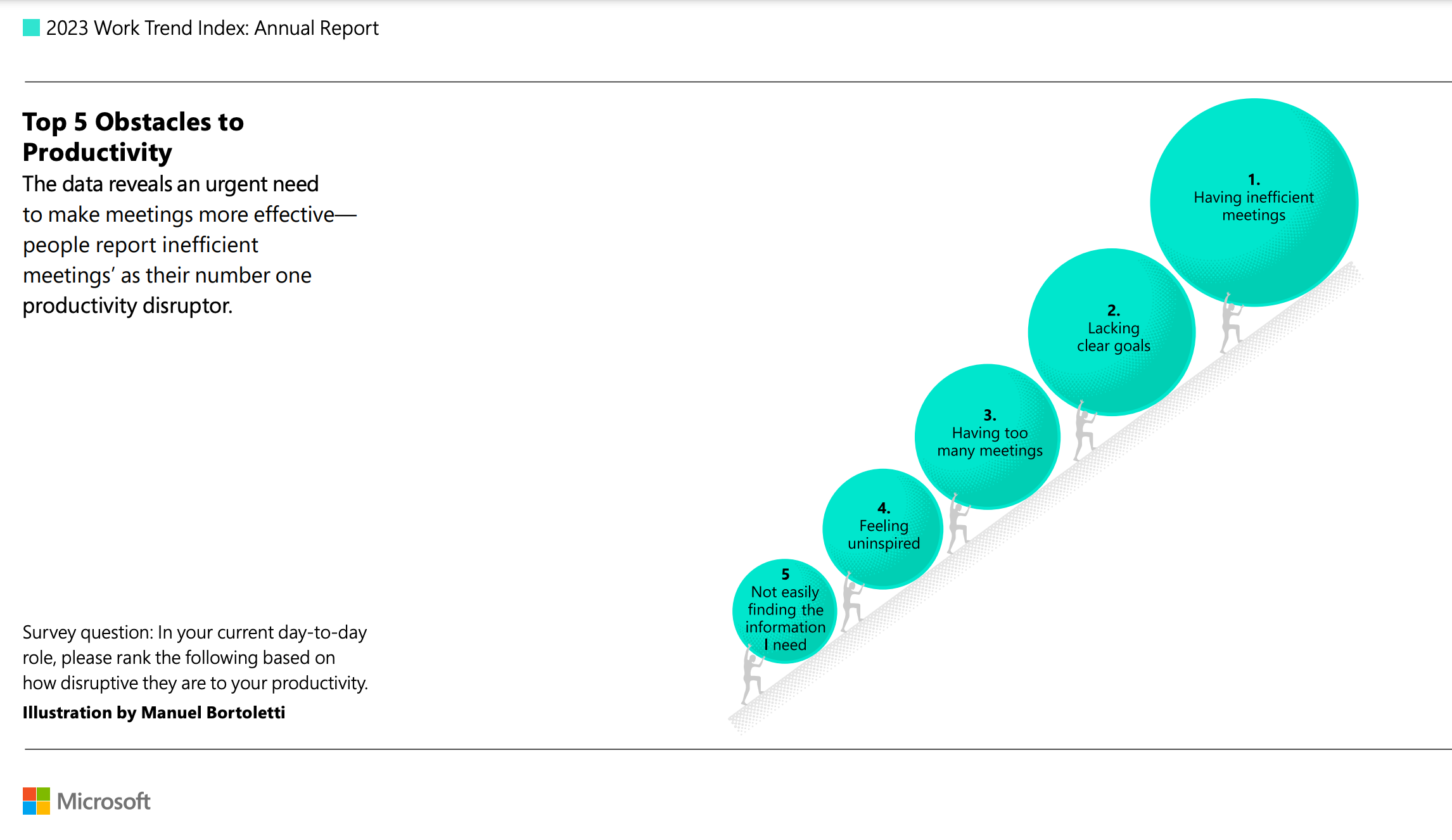 And its a problem that has been well researched and documented since the early 2000's. In fact, a Microsoft Personal Productivity Survey from 2005 suggested 50% of all meetings were considered time wasted by employees. So even their technology so far has done little to address this problem. Perhaps AI is the technology to vanquish this finally?