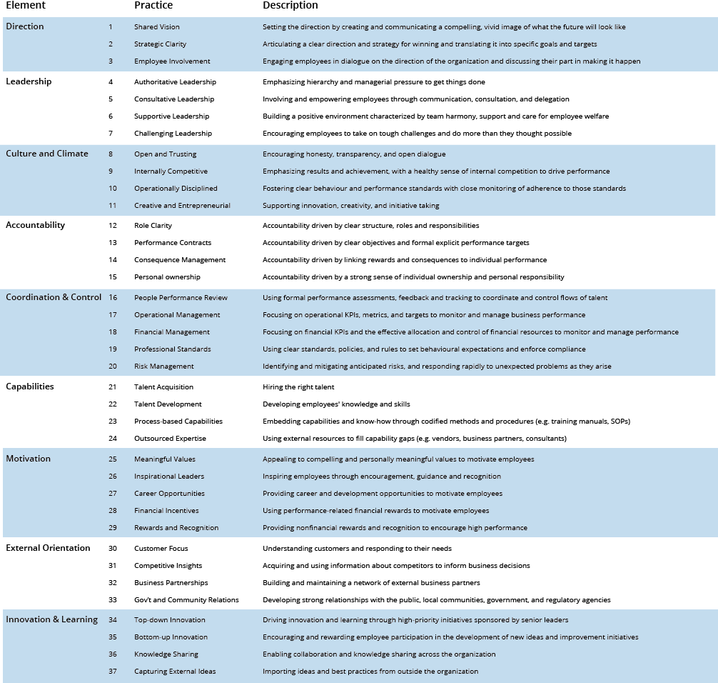 What we consider to be the most comprehensive and rigorous research on enterprise performance by Scott Keller and Bill Shaninger - for their books Beyond Performance, and Beyond Performance 2.0 - suggests that for organizations to deliver the magic mix of Performance and Health for both employees and the company, means “Having six or more top-quartile practices yields an 80% likelihood of being in the top quartile for health overall” out of these 37 practices: