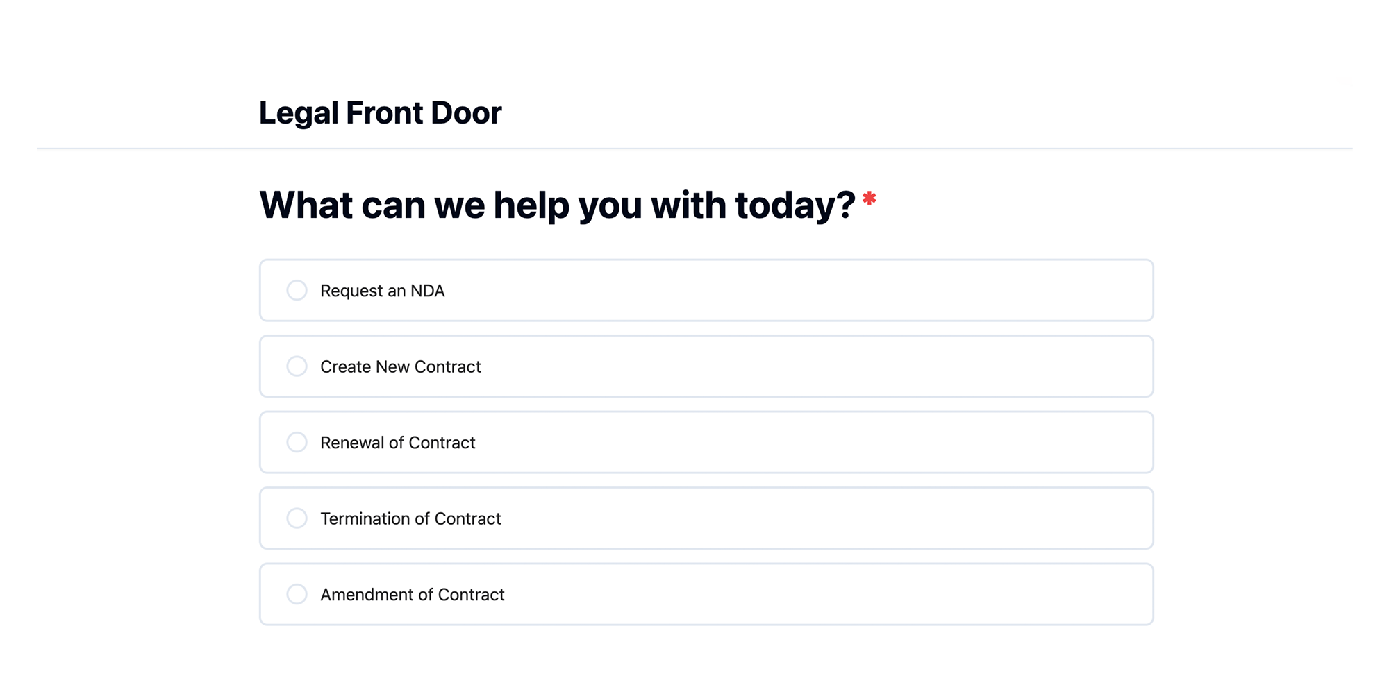Capture requests through adaptive, self-service experiences that ensure the right information is collected upfront—without legal team involvement.